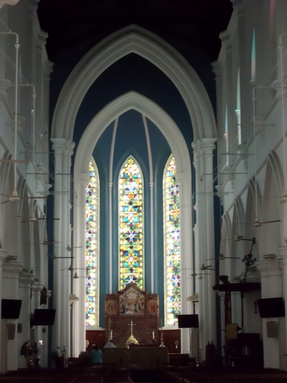 ラッフルズホテルからマーライオン公園まで歩いていく途中に白亜の大聖堂が見えたので立ち寄ってみました。あたりはヨーロッパのような雰囲気。大聖堂の中も見学できます。ステンドグラスが綺麗でした。中はあたたかみのある感じがしました。南国だからでしょうか?