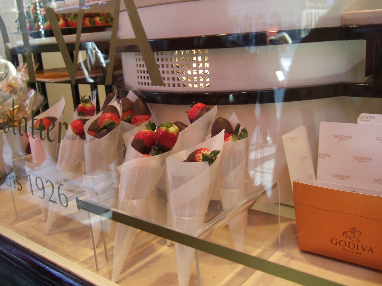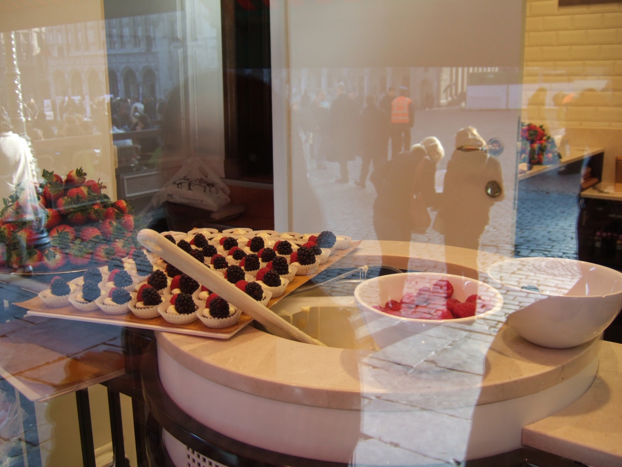 グランプラスの角にあるゴディバ。ディスプレイにはチョコレートの付いた生いちごが並んでいます。
