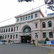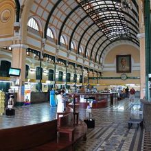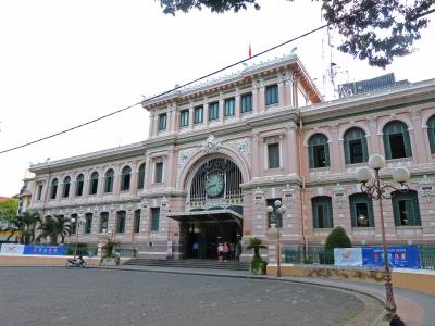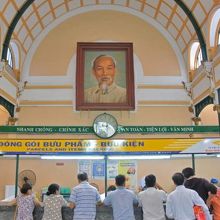 「中央郵便局」に行きました。19世紀末、フランスの統治下時代に建てられた建物で、パリのオルセー美術館(当時駅舎)をモデルにしたといわれています。鉄骨設計は、あのギュスターヴ・エッフェルが手がけたとか...。正面から入ると、アーチ形に造られた天井は奥行きがあり、駅舎といわれれば、確かにそんな造りに見えてきます。アーチの正面には、ど~んと飾られた大きな「ホーチミン先生」の肖像画があり、インパクト大です。