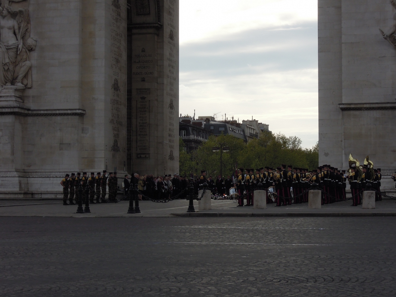 夕方、何気に凱旋門を撮影していると衛兵さん達がわらわらと楽器を持ってやってきました。整列したかと思えばスーツを着用した年配の老兵(?)さんがやってきて、セレモニーをしてました。とても厳かな雰囲気でした。