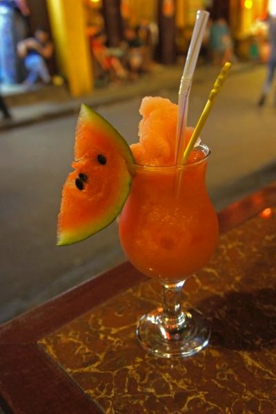 築150年の中国式家屋を改装した「イエロー・リバー」でお茶休憩をしました。中国の陰陽思想に基づく「陰陽窓子」と呼ばれる窓を残す、ホイアンで唯一の建物で、とても雰囲気のあるカフェです。陰陽窓の、陽(男性)窓テラスで、通りを眺めながらのカフェタイムは最高でした!主人は、ベトナムコーヒーのアイスバージョン。甘くて、日本のコーヒー牛乳のような味わいです。私は、すいかクラッシュをいただきましたが、これがおいしい!ホイアンは素敵なカフェが多いので、いろいろ入ってみましたが、我が家はここが1番のお気に入りで、2度通いました。