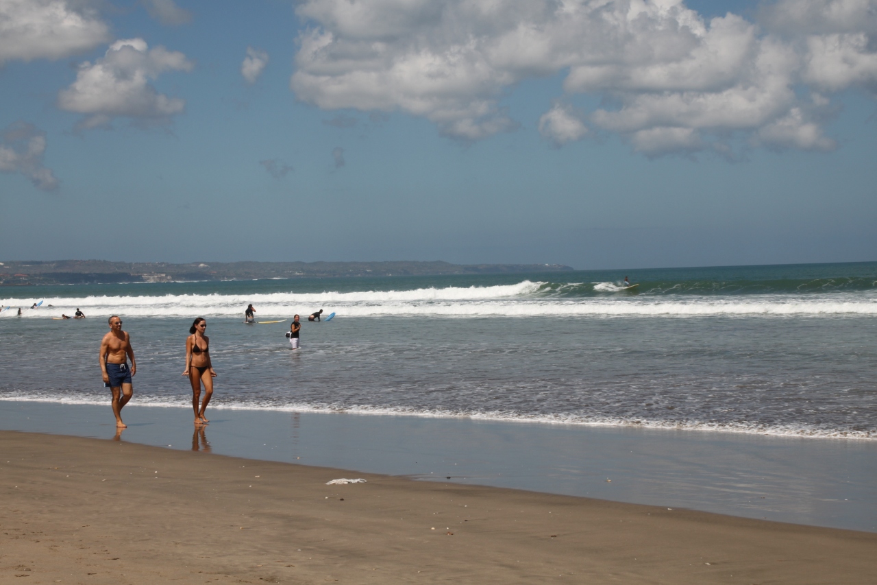 クタ地区の安宿に泊まっていました。繁華街の喧騒を忘れてビーチに出てみると、波が高く泳げる雰囲気ではありません。どうやら、ここはサーフィンなんかを楽しむのに適したビーチのようです。それにしても、白人さんは肌を露わに日光浴を楽しんでますね。