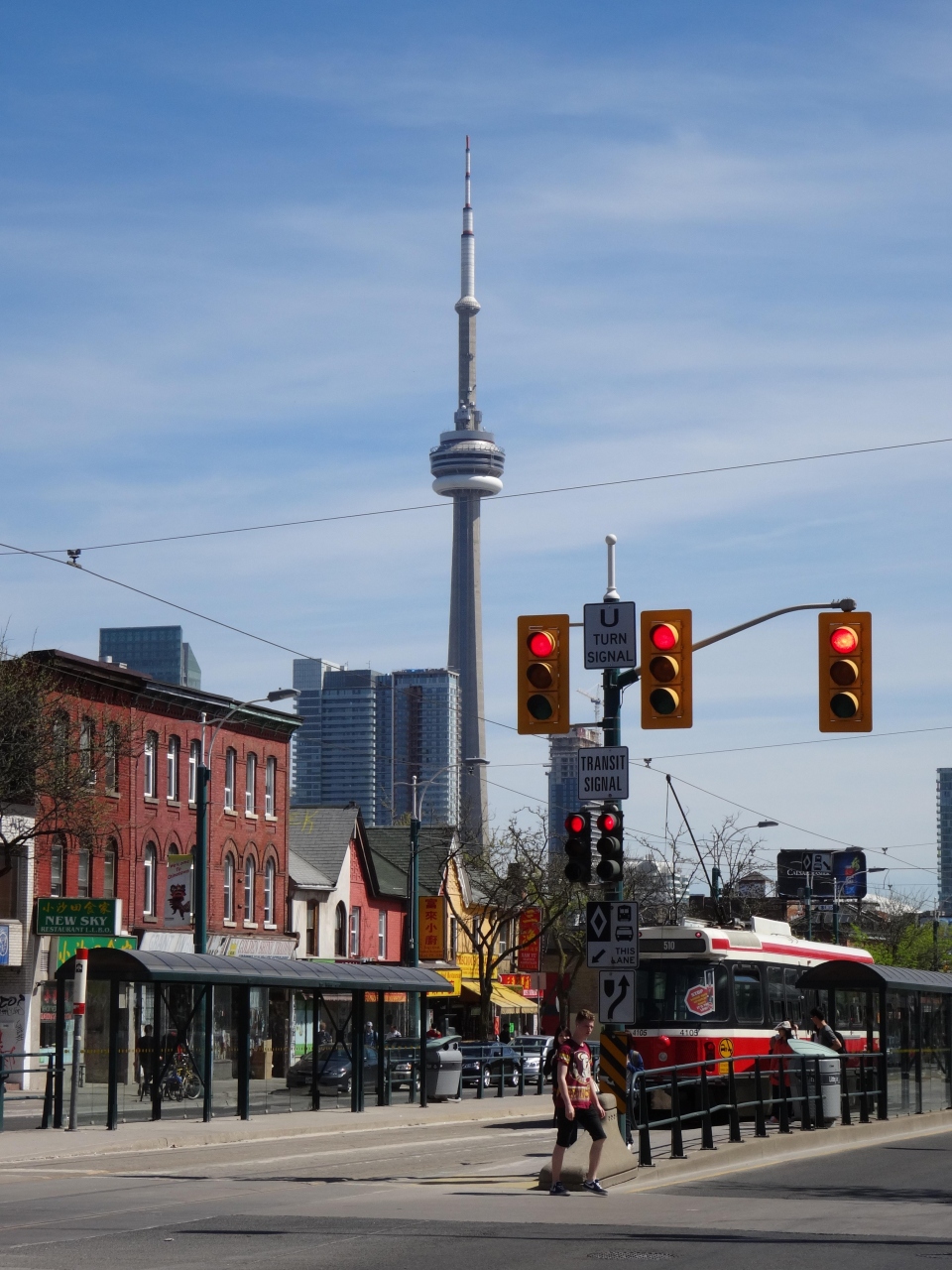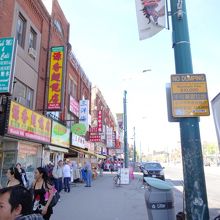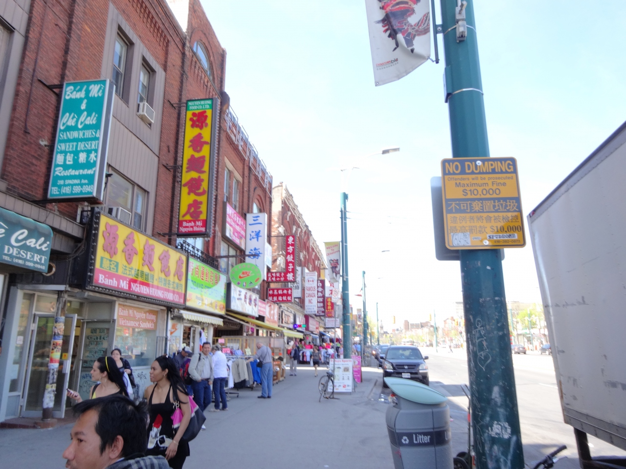 $10for5(5枚で10ドル)のTシャツ等が、店先にところ狭しと並べてあります。何でも安く売られています。質は?。少し歩けばリトルイタリーもありますが、こちらは小規模です。高い建物に遮られていないのでCNタワーも良く見えます。
