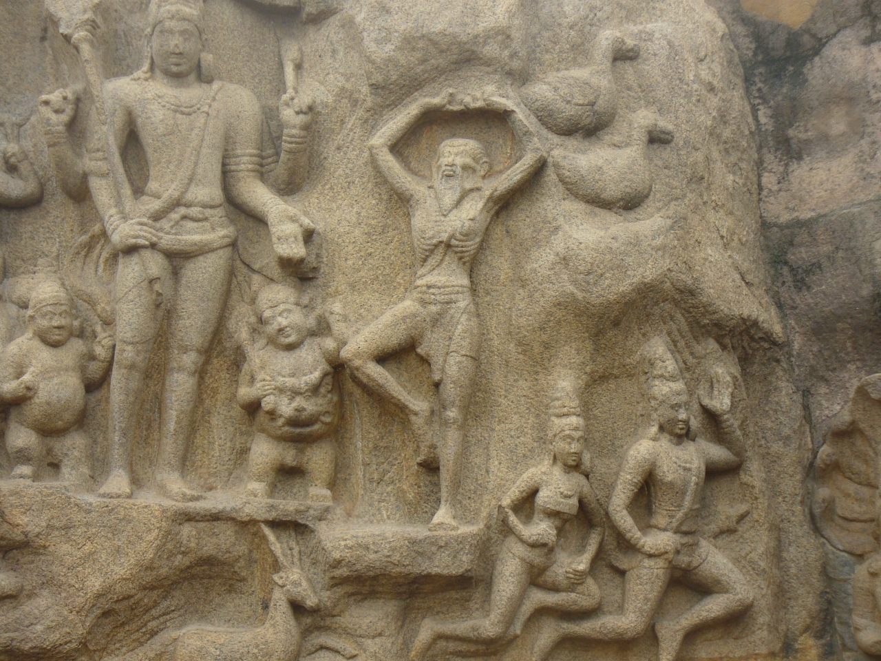 中央のくぼみガンガー(ガンジス川)を表し、元々天界の川であったガンガーが地上に降り立つ際の衝撃を、シヴァ神とナーガ(蛇の神)が受け止めている様子表しているとも言われているが、よくわかっていないようだ。とにかくこの世界最大級の巨大レリーフは観るものにヒンドゥー教の世界観を訴えかけている。