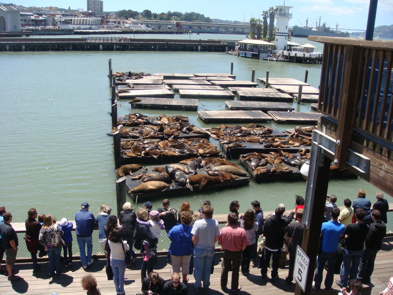 桟橋の上に何やら黒い影があるなと思ったらアシカでした。それも一頭や二頭ではなく、数えきれないくらいいました。