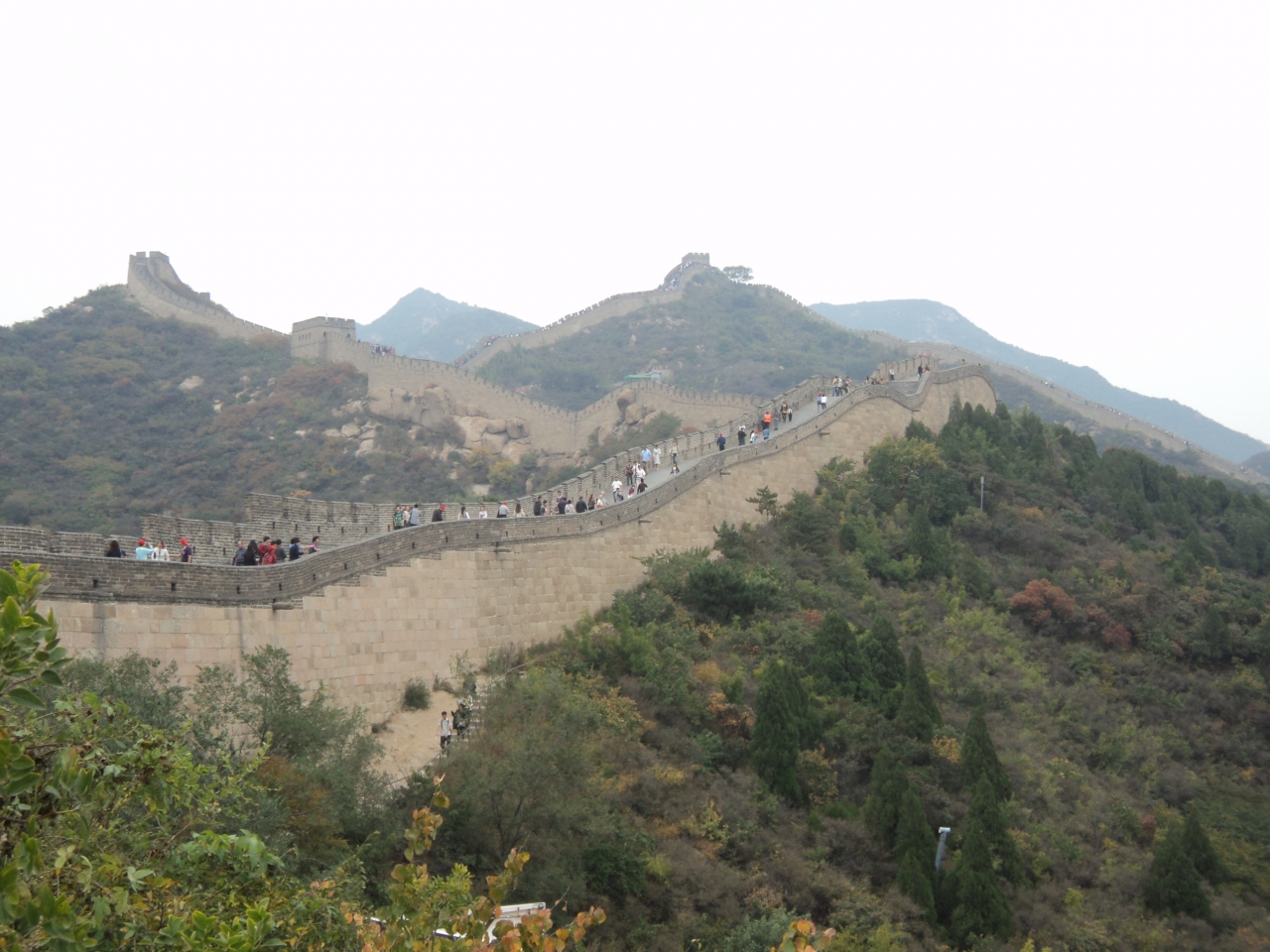北京北駅からの列車で行きました。チケット売り場は長蛇の列でしたが、一番端に長城行き切符専用?のブースを発見し、ほとんど人は並んでおらず、すぐ買えました。片道たったの6元!エアポートエクスプレスの25元の4分の1。予定していた電車は満席で1時間半ほど駅で次の列車を待つことに。現地は確かに整備されすぎで、どっかのテーマパークのアトラクション?と思えなくも無いですが、まあ、万里の長城の一部には違いありません。坂が急すぎて少し上ってギブアップ。夫だけ遠くまで行ったので待ってました。