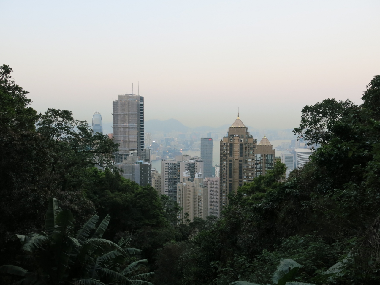 途中までは、ヒルサイドエスカレーターを使って、中環から歩いて登りました。トータル1時間半ぐらいかかりました。登山道は舗装されており、車の通行が止められているので歩きやすいですが、途中の傾斜はかなりきつく、周りは完全に登山ルック、少なくともスニーカーで、サンダルにスカートで登っているのは私たちぐらいでした。16時前から登りはじめたので、サンセットと夜景の両方を楽しめました。登山道は街灯が少なく、日没後は真っ暗になってしまうので、帰りはケーブルカーを使っておりましょう。