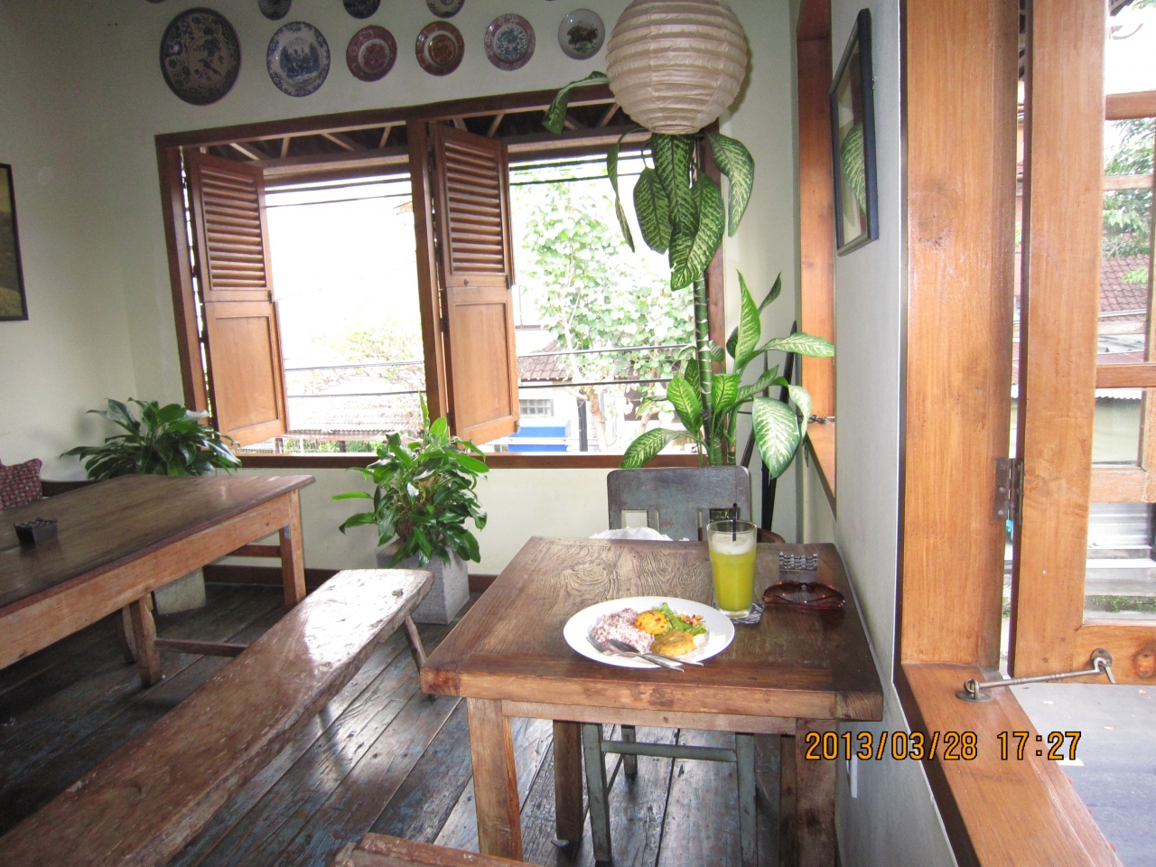 二階は窓が多くて明るく、インテリアはアンティークな雰囲気でまとめられていて、木製家具、壁に飾られたお皿や昔の写真等、全体的にお洒落な感じでした。