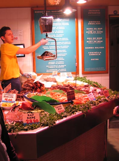バルセロナに数件あるらしいです。ホテルにも近いサグラダ・ファミリアの近くの店へ行きました。一本通りを入ったところにありますので人が並んでいないとわかりづらいかもしれません。入口で海鮮の種類と量と調理法を選んで飲み物をオーダー、会計をして番号つきのレシートをもらい空いている席をゲット。料理が出来上がると番号が呼ばれますのでセルフで受け取り、食べ終わったら配膳へ戻す社員食堂式ですね。結構おいしいし、安いのでサービスは我慢でしょう。