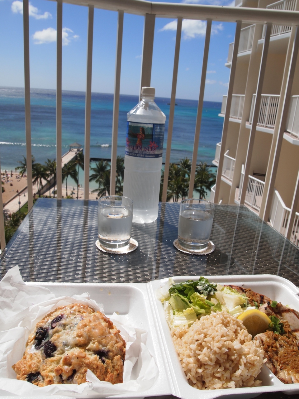 ダイアモンドヘッドに登った後、徒歩でワイキキに戻る途中に寄りました。人気のブルーベリースコーンは、下調べしているときは値段が4ドルくらいするなんて高いな、と思ってましたが、実物を見ると巨大なスコーンでしかも結構美味しいので値段に納得しました。プレートランチも美味しかったです。周りには落ち着いて食べられるような場所はなかったのでホテルに持って帰って頂きました。