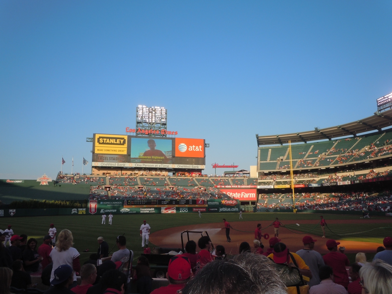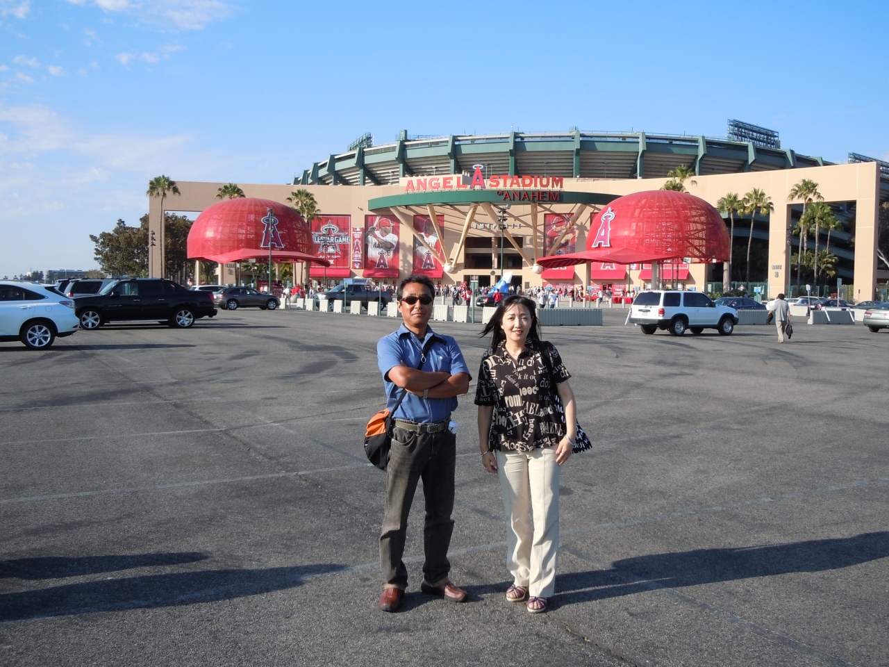 エンゼルス球場は、正面ゲートの野球帽の屋根が面白い。