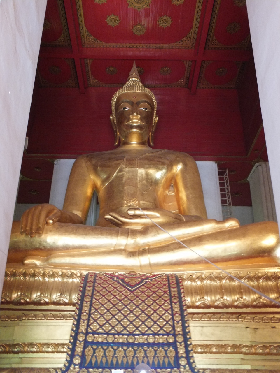 三角の特徴のある本堂の中に金色に輝く大きな坐像。