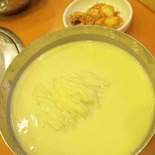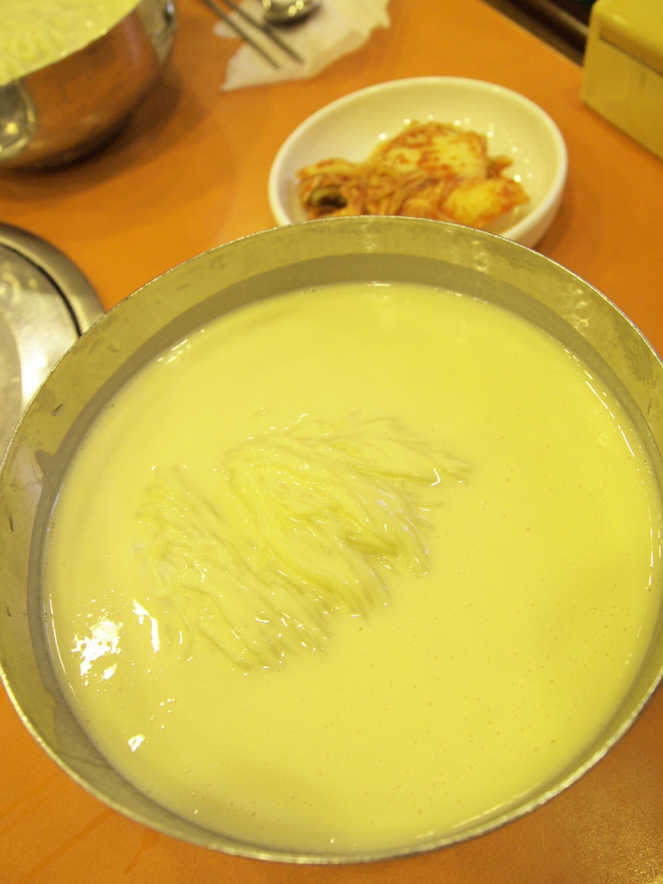 ここのコングクスは、とてもスープが濃く豆の味がしっかりしていて美味しかったです。塩など置いてなく、そのまま食べても美味しいとお店の人がおっしゃっていましたが、その通り最初は美味しくいただいていました。量も多いので、少し飽き気味になってきたらキムチと一緒に食べ、また食べ進めることができました。キムチも美味しかったです。麺にもコシがあり満足の1杯でした。