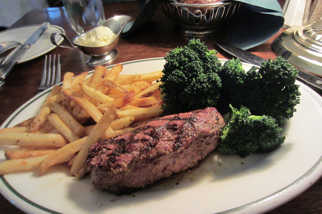 頼んだのはクラムチャウダーと7オンスのサーロイン。パン・フライドポテト・ブロッコリーが付いてきます。