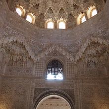 八角形の縁で支えられたイスラムの建築様式の鍾乳飾り(ムカルナス)のドームはアルハンブラ宮殿を訪れる人を必ず魅了します。鍾乳石のモノトーンが作る陰影が万華鏡のようにも感じます。天井に近いステンドグラスの窓からの採光が鍾乳飾りの精緻さをより引き立てます。