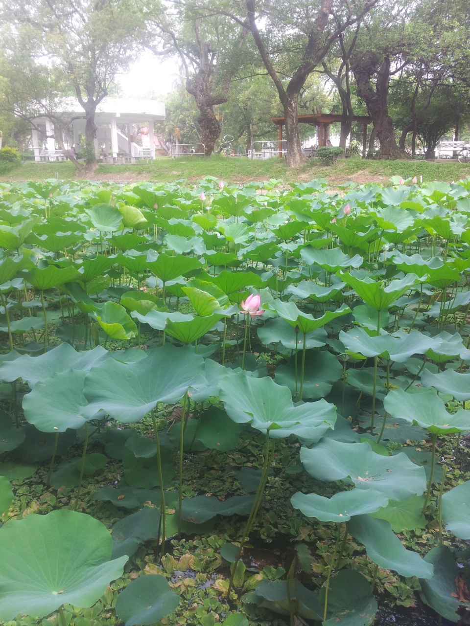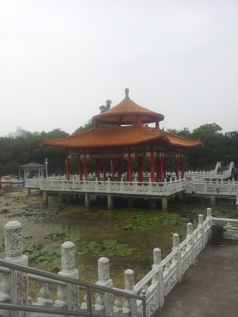 蓮の花が咲いている池もあり、中央付近には中華風の東屋が。