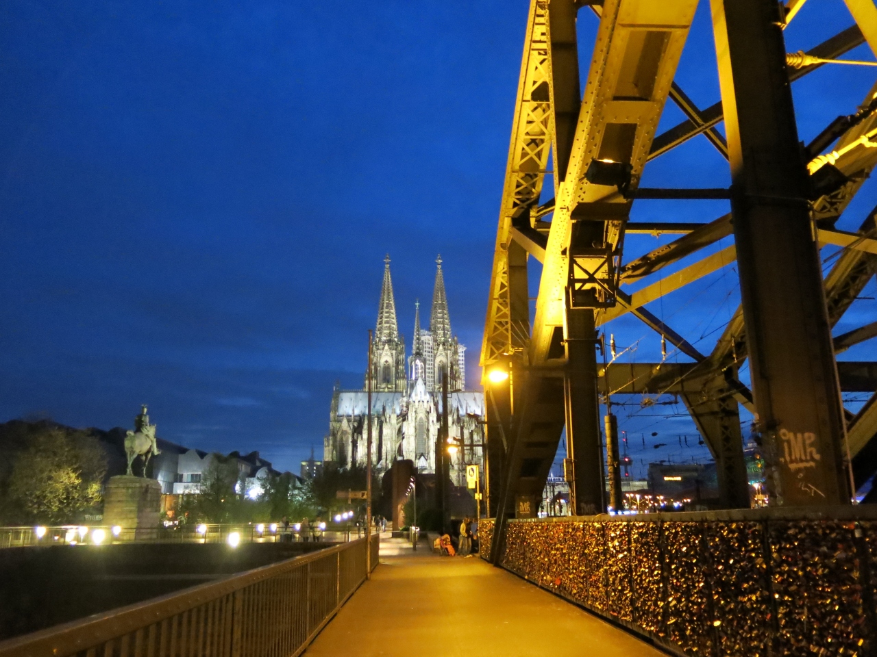 ライン川にかかるこの橋は歩いて渡ることができます。まずライン川も流域面積にびっくり。渡り切るのに、10分ぐらいかかります。そして、この橋には、江ノ島よろしく、カップルたちの南京錠がびっしりとかけられています。ライン川を挟んで見る大聖堂は絶景です。