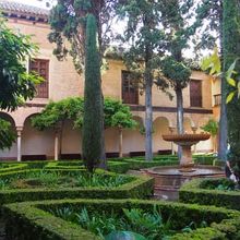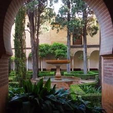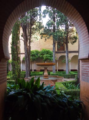 二姉妹の間に接する中心に噴水を備えた中庭がリンダハラの中庭(The Court of the Lindaraja)です。綺麗に整備されている五角形や扇型の生垣が幾何学模様を織りなしています。濃い緑とレンガ色の壁が日差しで更に強調されたコントラストが綺麗です。定期的に水打ちをされているせいか、とても涼しく感じます。