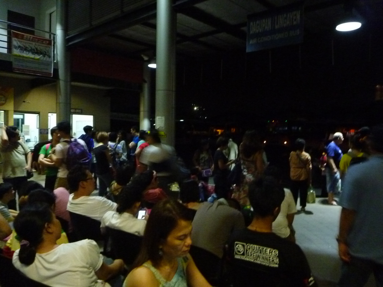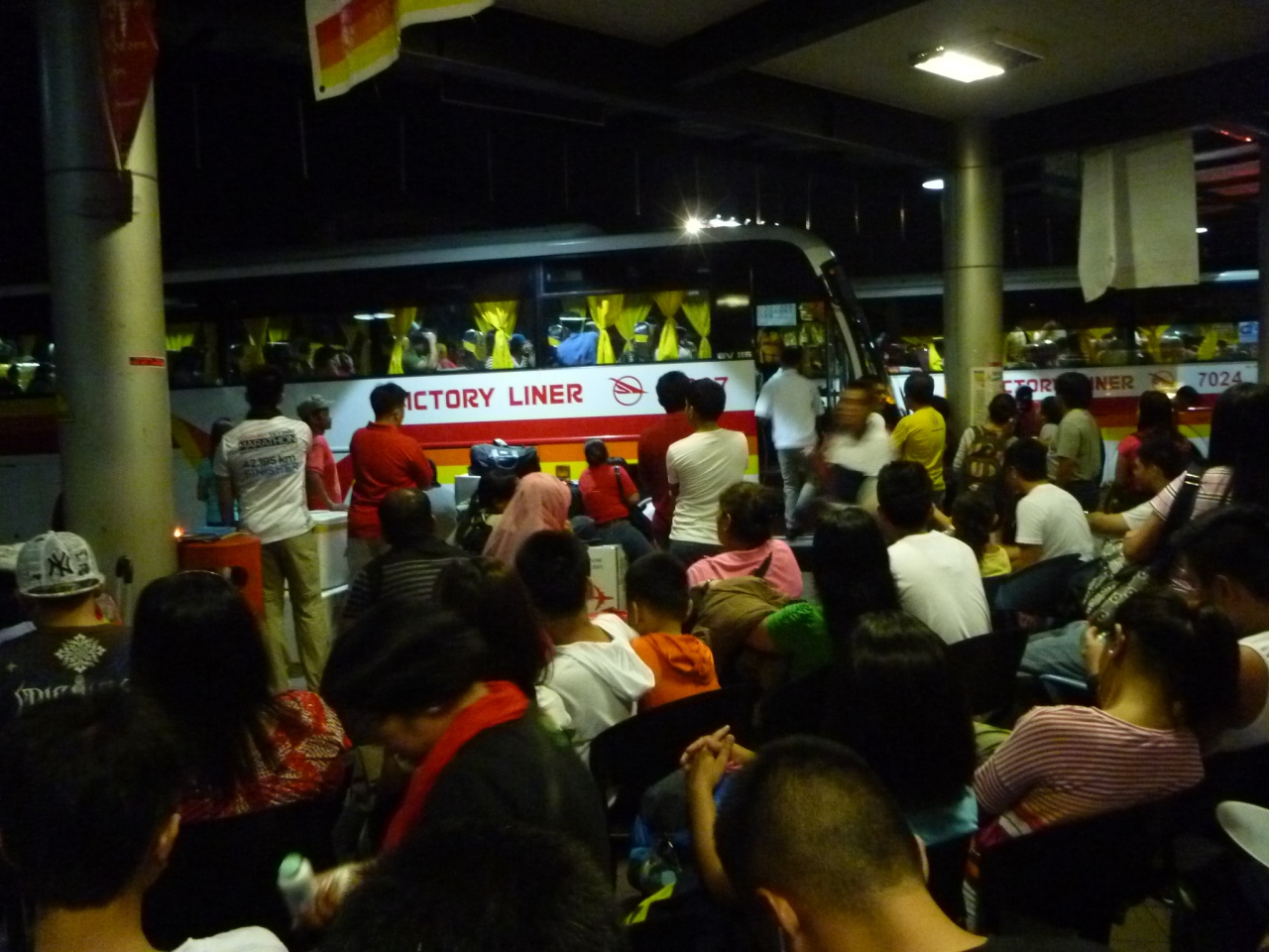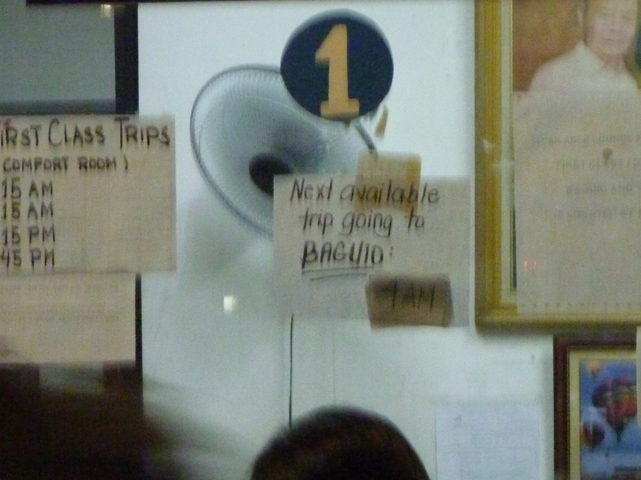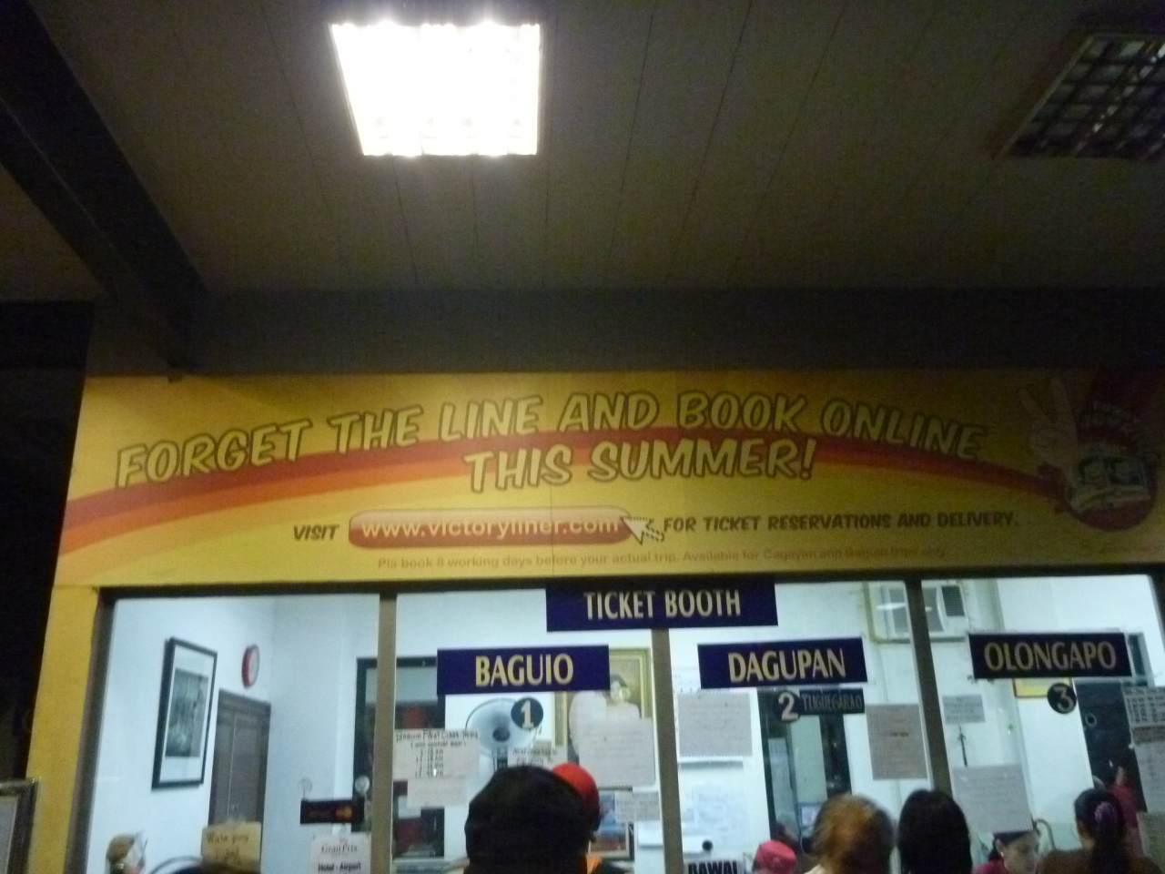 マニラのパサイにあるビクトリーライナーのバスターミナルからバギオ行きのバスはWEBからの予約できるようなのですが、予約開始が8時間前からなのでちょうど飛行機に乗る前位で事前に購入は困難。4月はちょうどフィリピーナ達がこぞって行くからかなり混むとは聞いていたので少しびびるも仕方ないので行きあたりばったりでアキノ空港からチケット売り場に行くと、一番早いチケットで5時間後の張り紙。