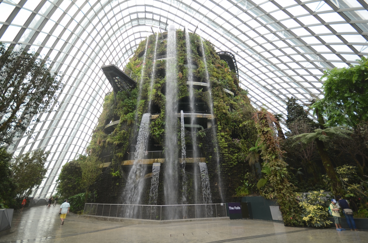 巨大な木のビルが立ち並ぶガーデンズバイザベイに2つのドームがあり、フラワー・ドームは様々な植物を鑑賞できます。もう一つのクラウド・フォレストは大きな山の形をしたビルから滝が降り注ぎ迫力満点です。ビルの山にはジェットコースターのレールようにブリッジが架けられていていろいろな角度から楽しむことができ個人的にはクラウド・フォレストの方が見ごたえがありました(入口に向かって右側のドームです)。
