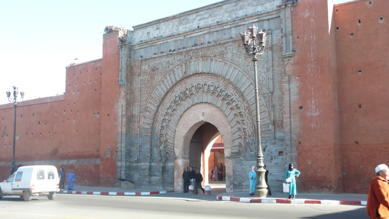 繊細な装飾が施され、非常にカッコイイ門です。城壁に囲まれたマラケシュのメインに当たる門ですので、カッコイイのは、当たり前かも知れません。ただ、門を写真に収めるのに道を渡らなければイケナイのですが、その道が結構交通量が多く写真に収めにくいのが残念です。