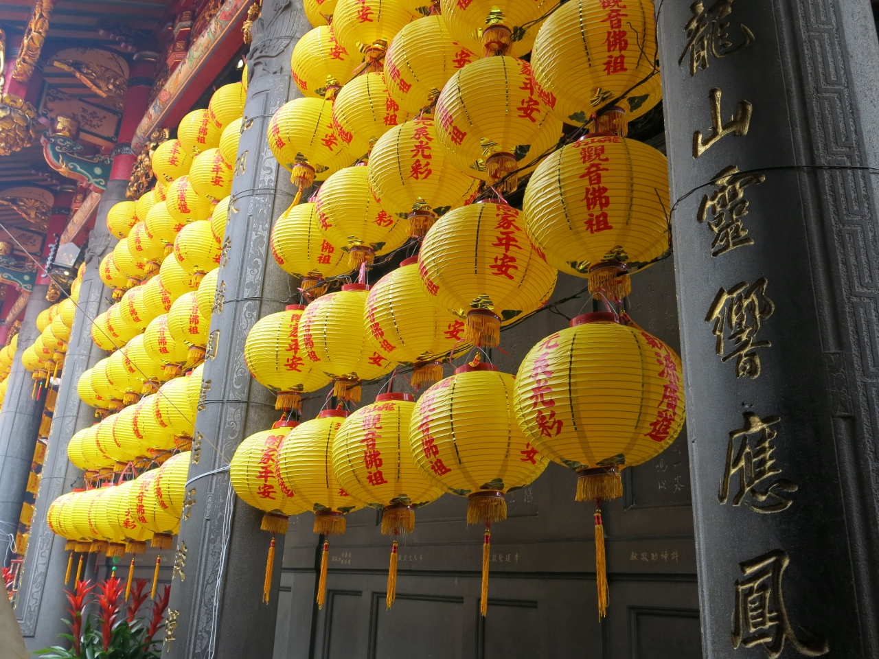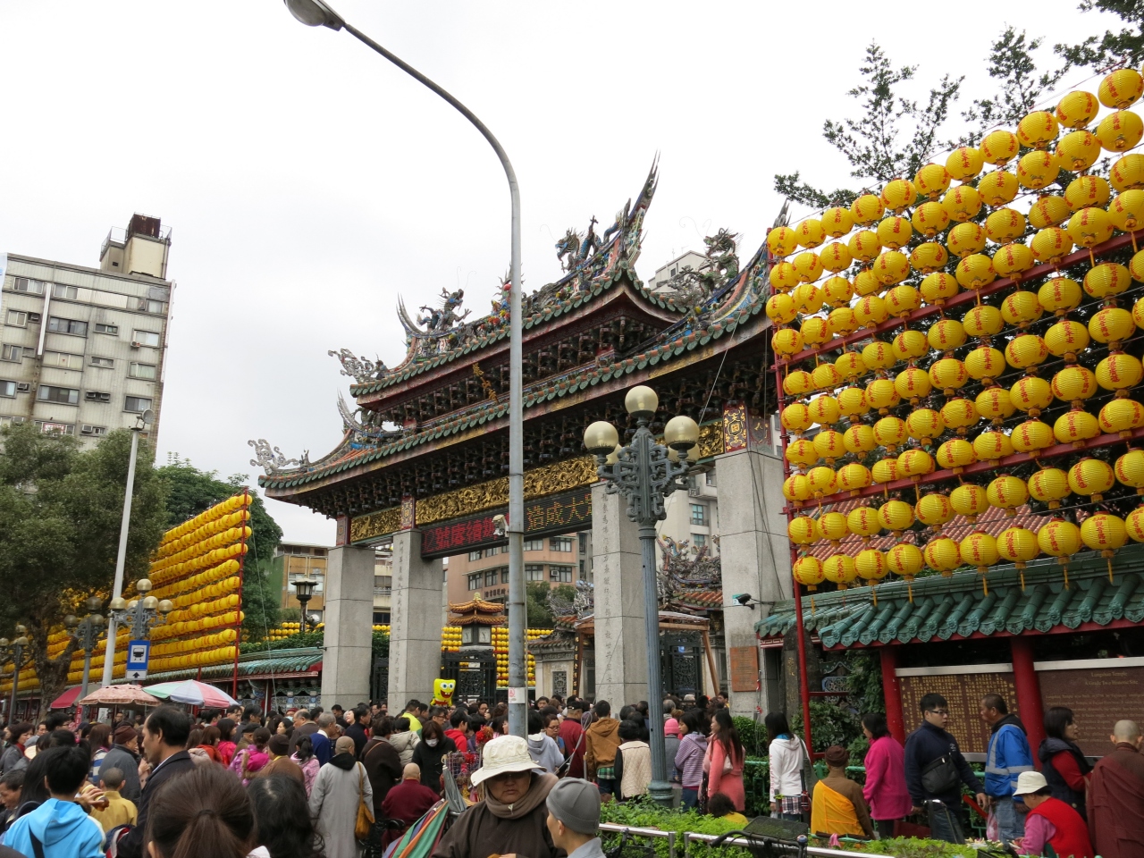 旧正月の元旦に当たる日の朝に行きました。最寄りの地下鉄駅からすごい人ごみでした。お寺の周辺には屋台や蚤の市が並び、さながら日本の初詣のようでした。電光掲示板には、新年おめでとうの表示が。中も大混雑でしたが、台湾流のお正月を垣間見ることができました。