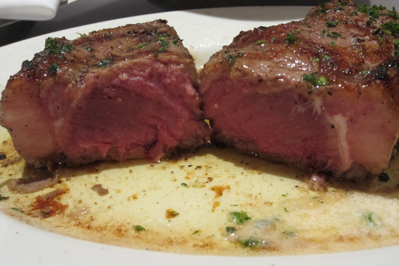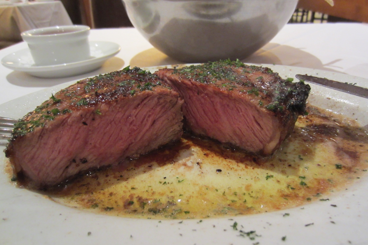 焼き具合はメディアムレアにて頼みます。皿が熱々で注意よと言われて出てきたのは、私には十分なボリュームの見事なお肉。確かに噛み応えはありますが、変な固さではなく、噛むごとに肉汁があふれてくるような、ジューシーさがあり、旨みが味わえます。塩・胡椒・バターくらいでの味付けでソースはなしです。その分肉の味が十分に感じられます。