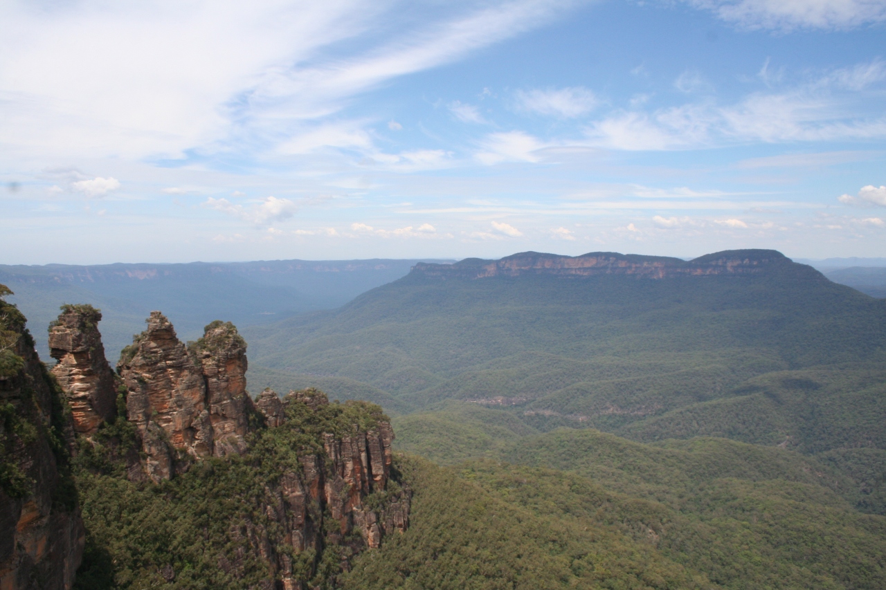 バスはダブルデッカーでした。最初の見所はカトゥーンバ・カスケイド。段々の岩場を水が流れ落ちる姿が見られます。そこから次のバスを待ってもいいのですが、ちょっとしたブッシュウォークが気持いいかもしれません。山の中の遊歩道を歩き、開けた場所に出ると、絶景が広がっています。地平線の果てに山が見えるところまで、ずっとユーカリの森。少し青く霧がかって見えるのですよね。山の中の空気はひんやりとしていて、とても気持ちいいです。