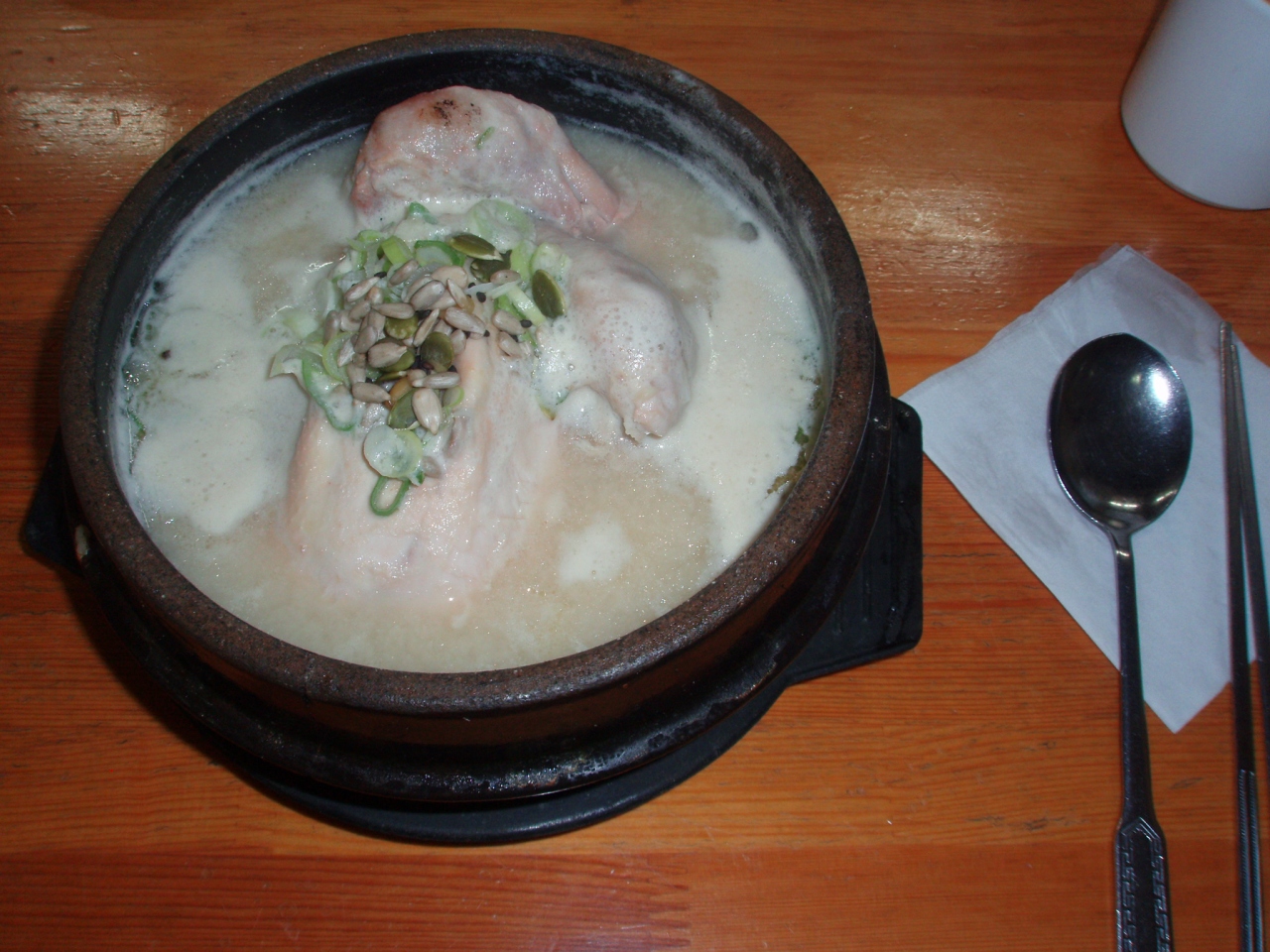 スープも濃厚ですごくおいしいです。鳥の中には、朝鮮人参、クルミ、クリなどが入っています。この店以外のサンゲタンを食べたことが