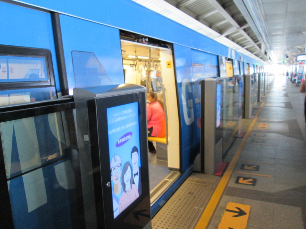 サイアム駅に安全柵ができていました。ただし、モーチット、ナショナルスタジアム駅方面のホームにだけ設置されており、オンヌット、サラディーン駅方面のホームには設置されていませんでした。サイアム駅は乗降客が多いため安全に配慮されています。