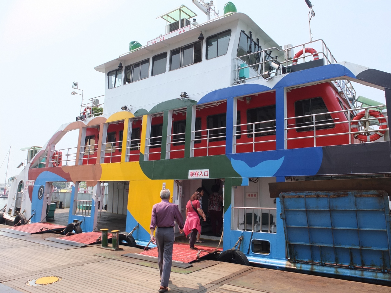 フェリーの一階部分に乗り込む(または降りる)原チャを船の2階から眺めるのが
