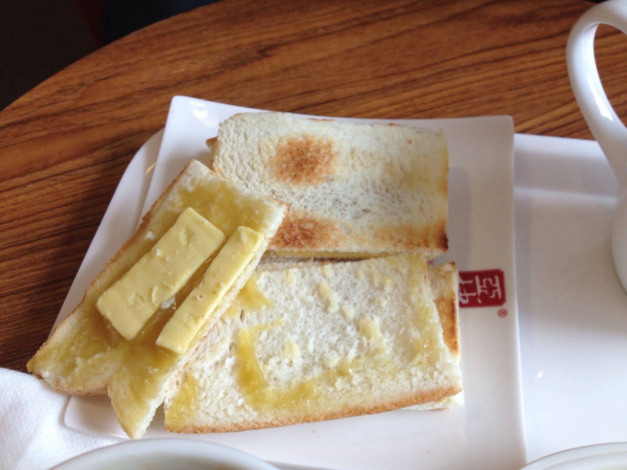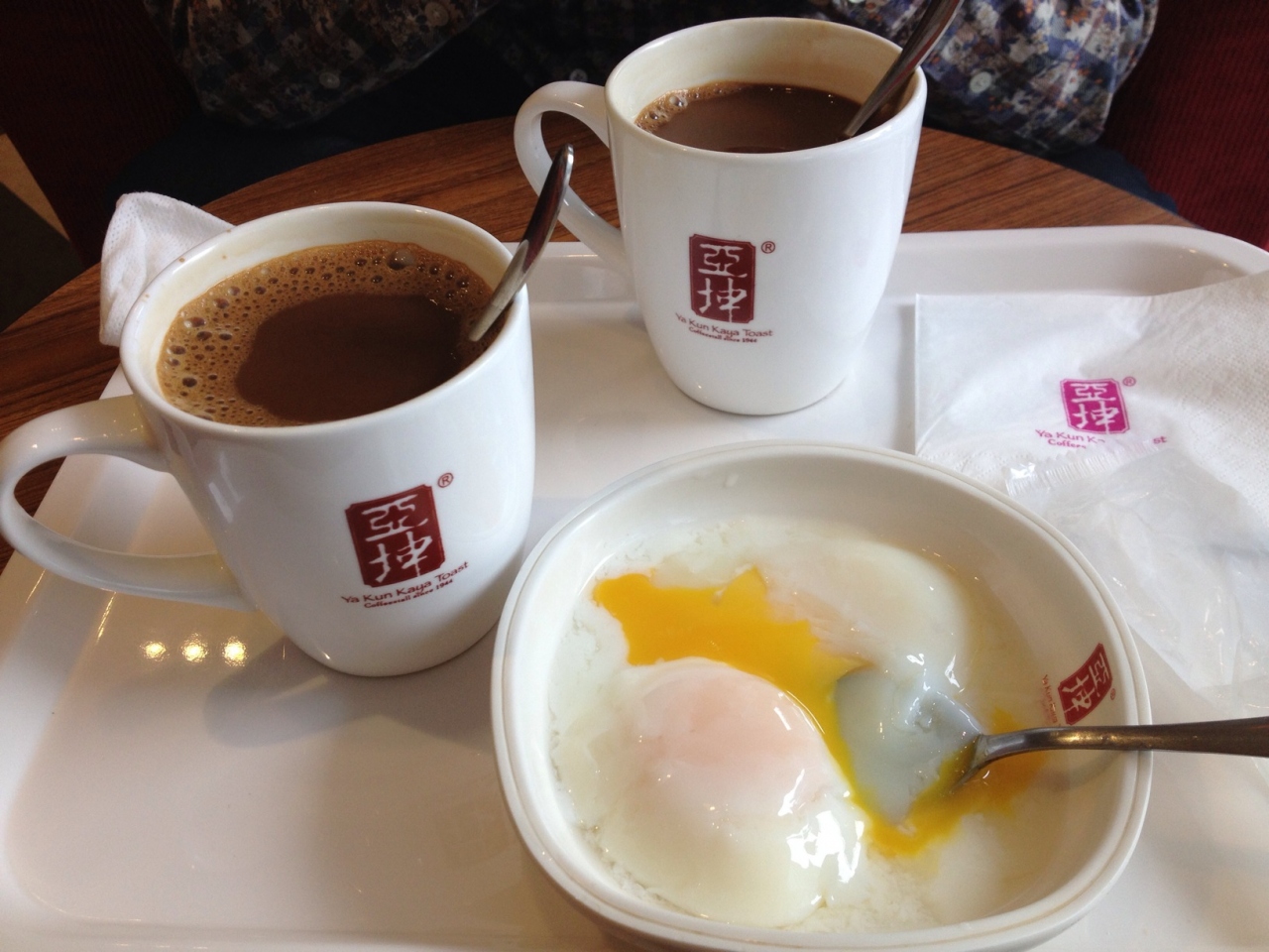 お店でカヤトースト単品、サンドイッチセットをオーダーしたらセットにはゆで卵とコーヒーがついてきます。茹で卵のゆで加減を聞かれたので5分熟(半分火が通った感じ)と言うと、殆ど火が通ってないくらいの卵が出てきました。フライドポテトに見える物はパンを揚げたもので、一緒についてくるカヤペーストにつけて食べるものです。カヤトーストにはバターとカヤペーストが挟まれていてカロリー高そう。でも美味しかったです。コーヒーもブラックとかはなく、砂糖とミルクがあらかじめ入った濃いめのコーヒーが出てきます。