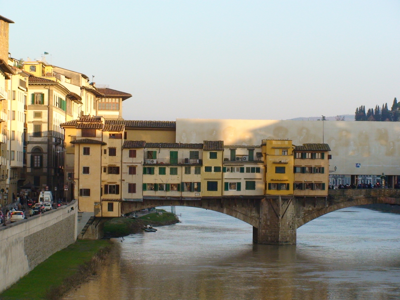 有名すぎる橋、橋の両側に貴金属のお店が並んでいます。少し離れて橋をみると何とも危なげに立っていると思えてしかたありません。大きな地震がきたら絶対に落ちてしまいそう。また、反対側の遠くからみて夕日を浴びる橋は本当にきれいでした。