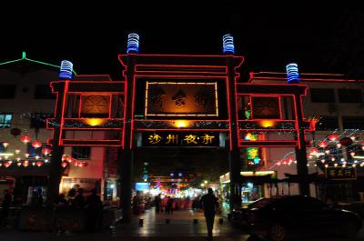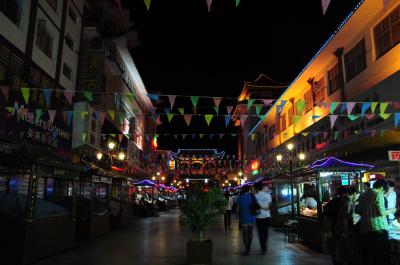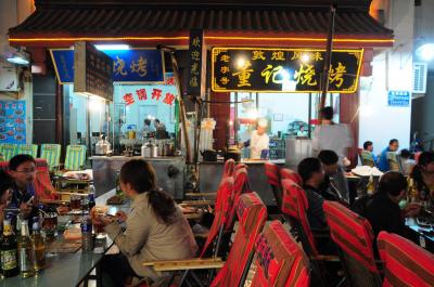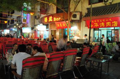 夜の敦煌で一番賑やかな場所だと思います。新彊から近いということもあり、新彊から運ばれてきた宝石類や敦煌ならではのお土産(夜光杯など)を売る屋台があります。串焼きやさんがずらっと並んでいるエリアもあり、雰囲気は抜群でした。ちょうどシーズンでない時期に行ったため、やや閑散としていましたが、歩きやすかったので逆によかったです。ここの野外レストランでロバ肉料理を食べました。このあたりの名物だそうです。串焼きもおいしく、おススメです。