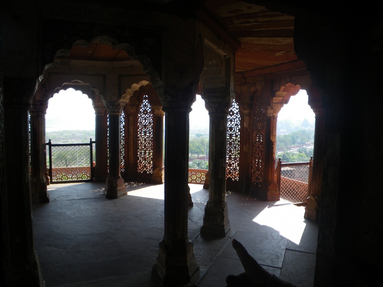 格安、世界遺産の旅ツアーで行きました。赤砂岩のお城で庭も広く見るところが沢山ありますが、やっぱりヤムナー河を見晴らす眺めは印象的でした。私が行った時は曇っていましたがアーグラ城からうっすらタージ・マハルが見えました。混み具合にもよりますが、ゆっくり見てまわると1時間はかかります。