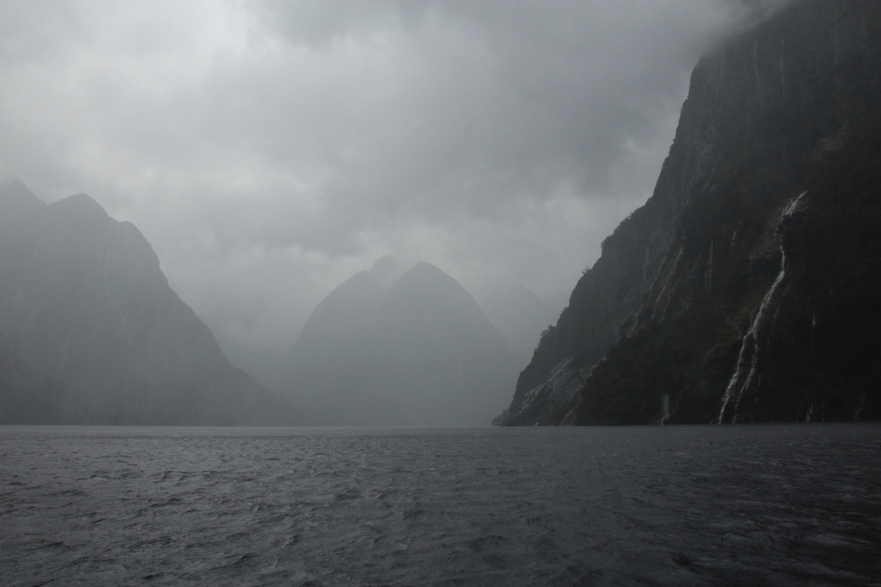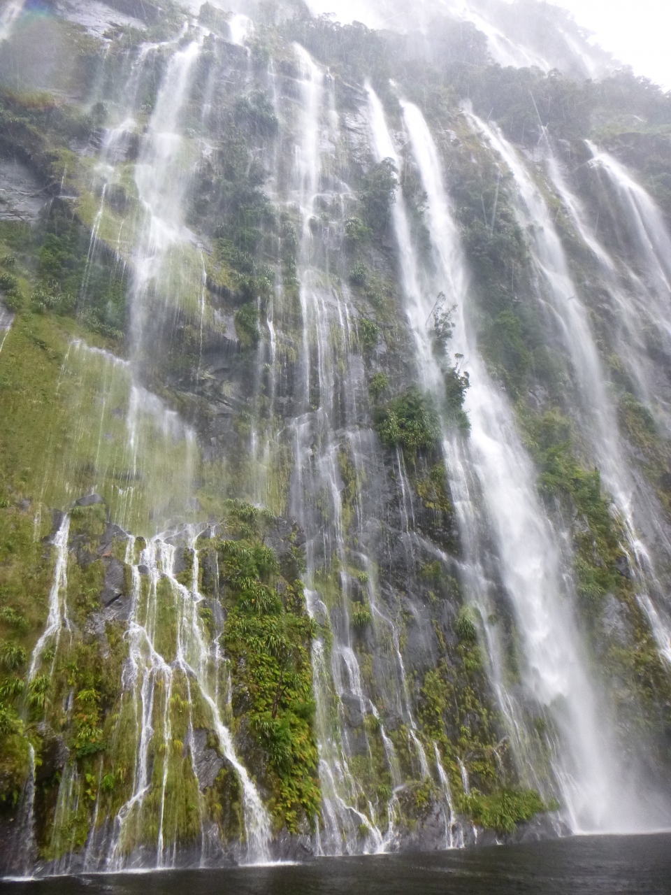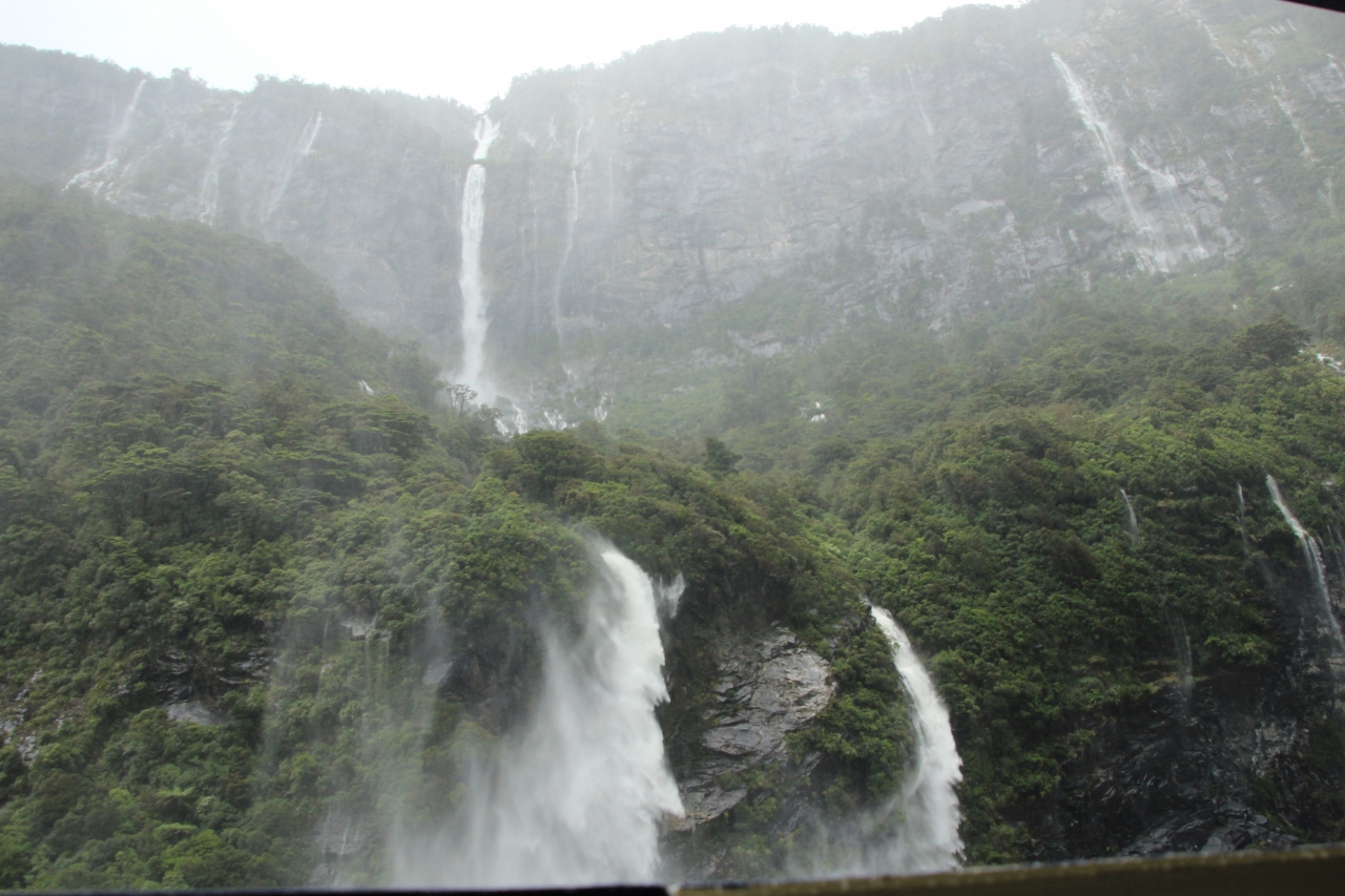 実はフィヨルドランド一帯、ニュージーランドで最も雨が多い所だそうで、快晴に出会えることは稀なんだとか。そしてサウンド沿いの山々の多くが岩山のため、雨が降ると土中にしみこむことなく、たちまち滝になって流れ落ち、名前のない滝が無数に出現!