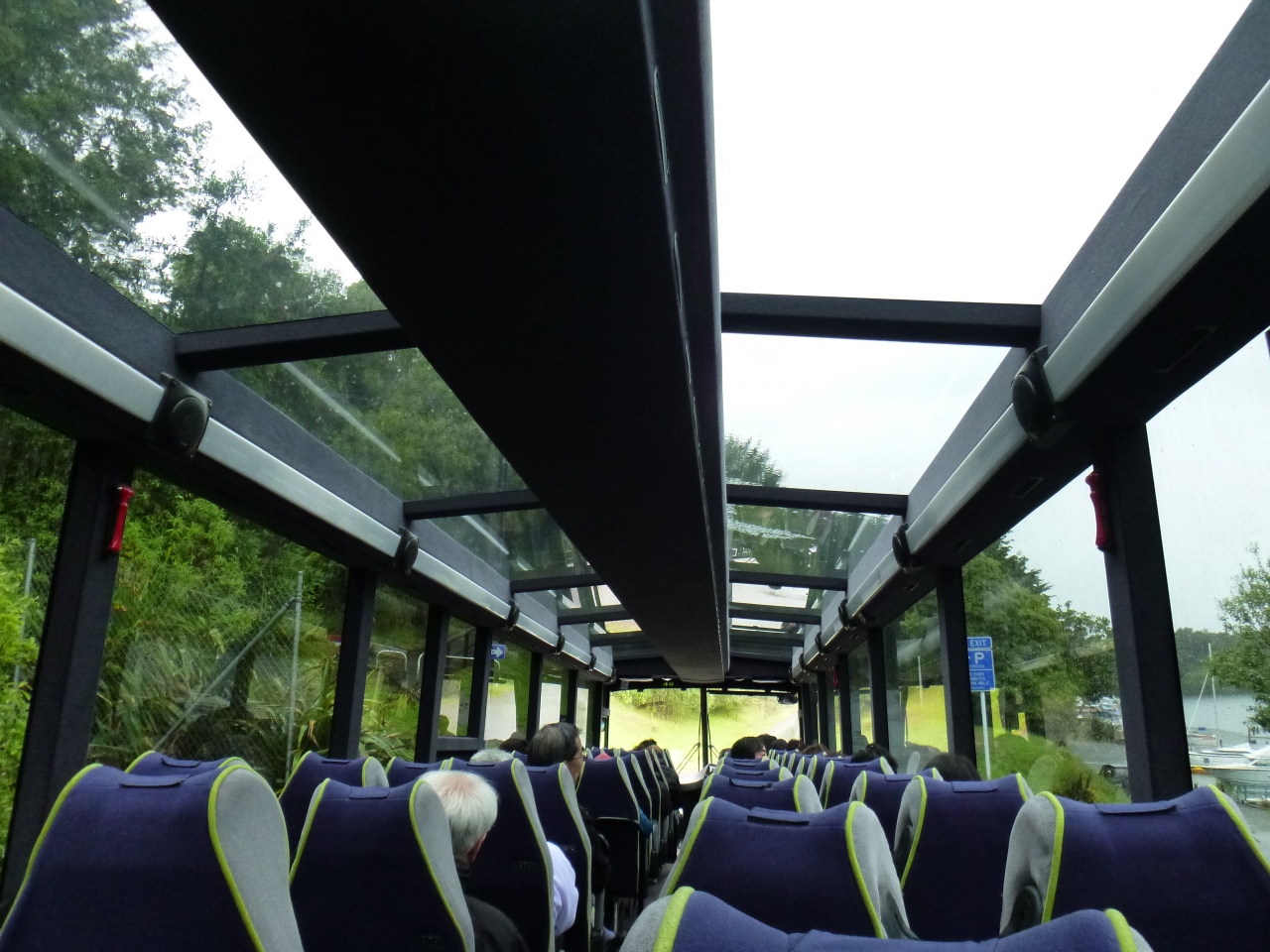 参加したreal journeysのツアーはクィーンズタウンからゆったりしたパノラマバスを利用します。往復8時間かかるので、ツアーを選ぶ場合はバスの乗り心地も重要かもしれません。また、3時間のクルーズには豪快なランチBOX(サンドイッチやフルーツ、スナック)と飲み放題のコーヒー、紅茶が付いています。船内はゆったりソファでくつろげ、トイレも複数完備されていました。