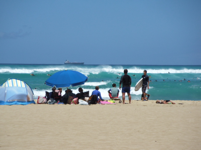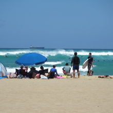 浜辺近くは海水浴者、遠くにはサーファー、浜辺には日光浴者と本当にたくさんの人がいます。まあ、日本の有名な浜のようにいも洗い状態ではありませんが・・・。