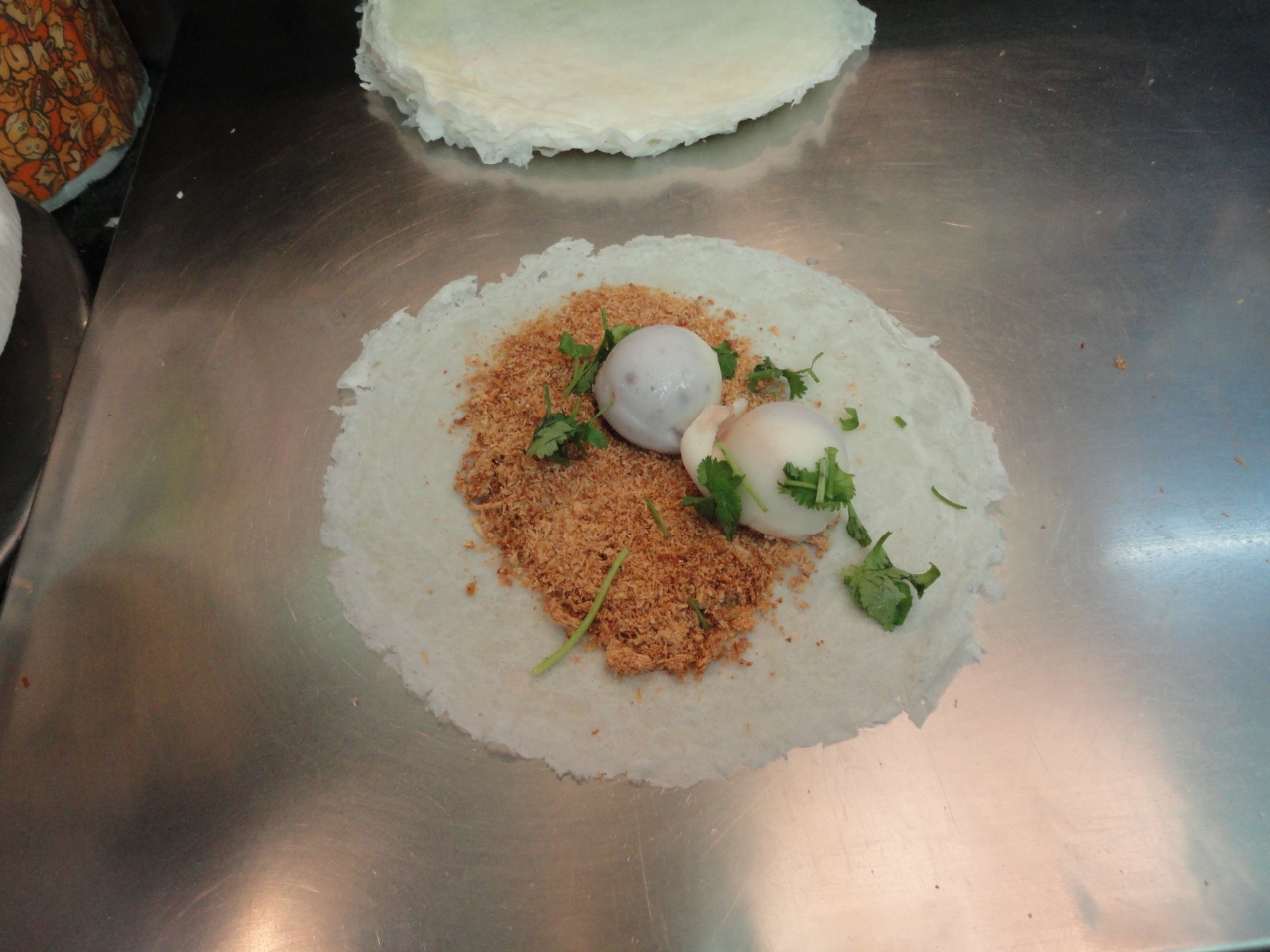 クレープ生地に、落花生でできた飴を削った粉と、アイス、パクチーを包んでいただきます。