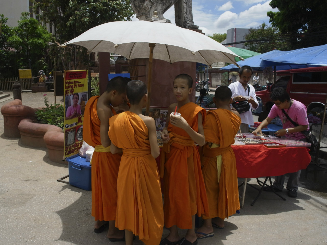 チェンマイの旧市街、ワットチェディールアンの隣にあるお寺ワット・パンタオ。辺りには屋台が立ち並び食べ物やみやげ品が売られています。チークで造られた黒光りする本堂からはどことなく威厳が。自由に拝観、参拝できるのもいいですね。