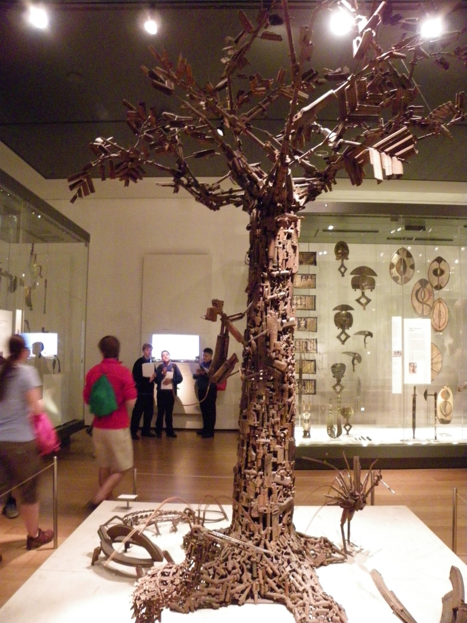 誰もが見たいと思うロゼッタストーンはあまり人だかりもなく拍子抜けしました。アフリカのアート(?)で、銃を使った作り物が展示されていました。アフリカは常に紛争の地でしたから、大量に今も残る銃。それを再利用し、アートにしてしまう力強さ。でも、実際に使われていた銃なのですよね。人殺しの道具(狩り用ではない)を大量に捨てるほど残した先進国の人間の罪深さを感じました。ところで、日本の展示がなくなっていました。廊下に日本の展示ケースだけカラのまま放置されているのもありました。???