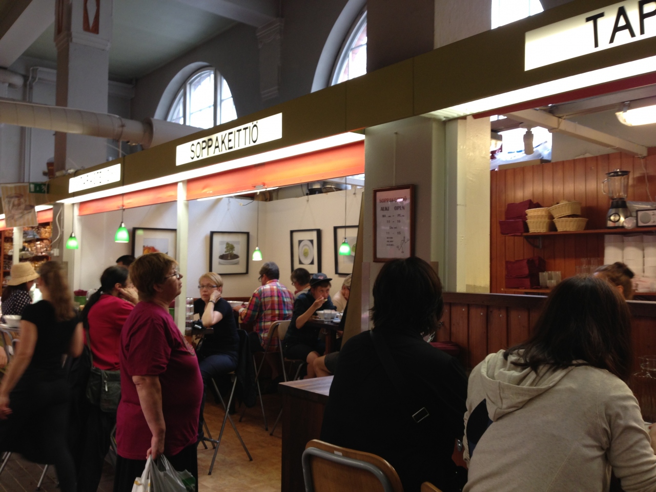 ハカニエミマーケット内一階にあります。この日のメニューは三種類。スープを選ぶと、二種類のパンが食べ放題です。スープでお腹いっぱいになるのかなと思いきや、ラーメンどんぶりかと見まごうほどの具だくさんのおおきなスープがやってきました。パンもおいしいので、たくさん食べてしまいます。また行きたい一店でした。