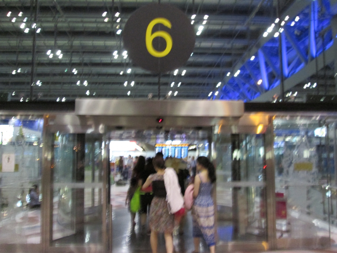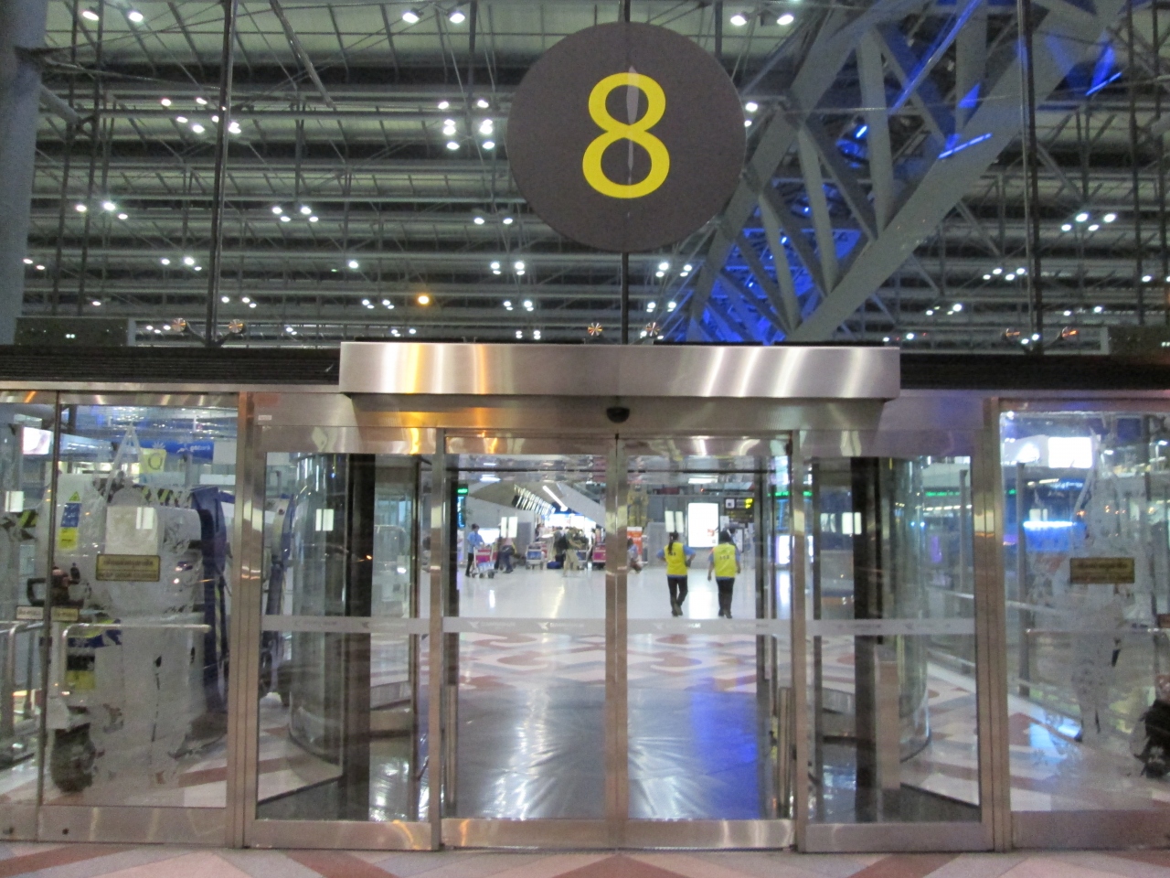 タクシーでスワンナプーム空港に向かう際、空港での降車番号を覚えておくと良いです。タクシー降車場所では航空会社のサインは見えず、空港の入口番号しか見えません。JALは「8」番、ANAは「6」番です。今回、JAL便を使用したので、「8」番と指定し降ろしてもらいました。