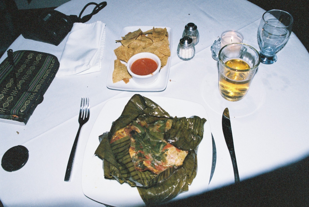頂いたのはユカタン地方の郷土料理、ポジョ・ビビル。鶏肉をバナナの葉で包み、蒸し焼きにしたものです。