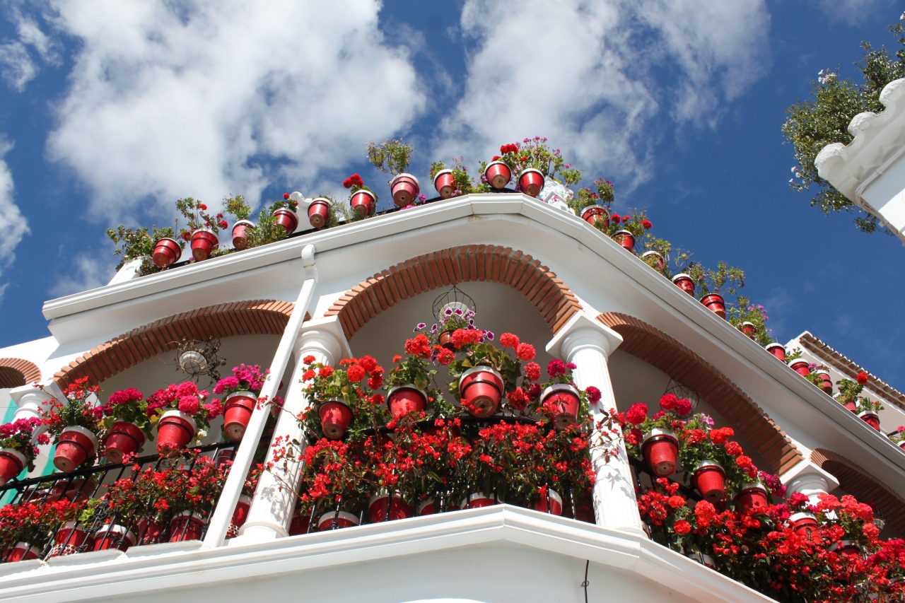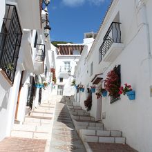 スペインのガイドブックで何回も見た白い家と花の道。青空と白い家と花の調和はやはり美しい。壁に飾られている花は住民の花をを愛する気持ちと観光客を喜ばせようとする努力のたまものでしょう。気持ちよくゆっくり歩いて眺めた。
