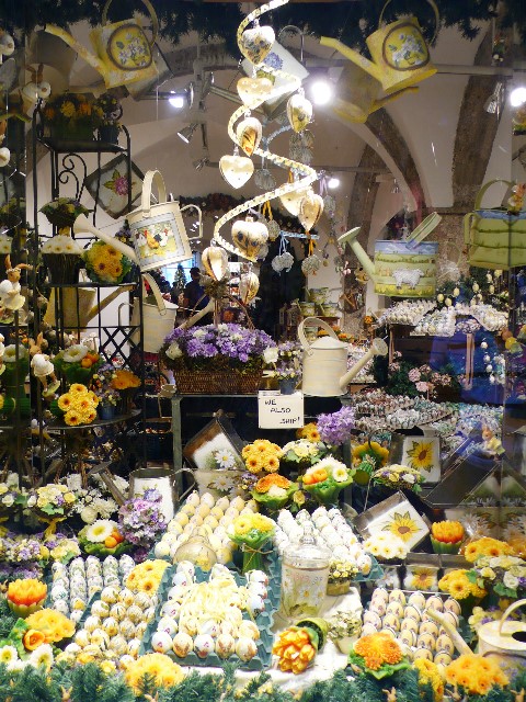 ザルツブルクの旧市街の目抜き通り、ゲトライデガッセを新レジデンツに向けてユーデンガッセを歩いていくとあるのが、クリスマス・イン・ザルツブルクとイースター・イン・ザルツブルクです。ここでは、クリスマスとイースターの飾りを安いものから高いものまで一年中売っている店です。手作り感のある素朴なオーナメントやガラス玉、卵にペイントしたものなどが、店内所せましと置かれています。イースターは日本ではあまりなじみがありませんが、春にあるキリスト教の行事(復活祭)で、ヨーロッパではクリスマスに並ぶ大イベントです。卵やウサギの飾りが多いようです。写真はイースターの飾りです。
