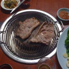 とても広い板間にべたっと座ります。少し薄暗いような空間ですが、それがいい。日本語のメニューもあったと思います。注文はソグムグイとデジカルビ。ソグムグイは分厚かったセマウル食堂のものよりはかなり薄切りかな?