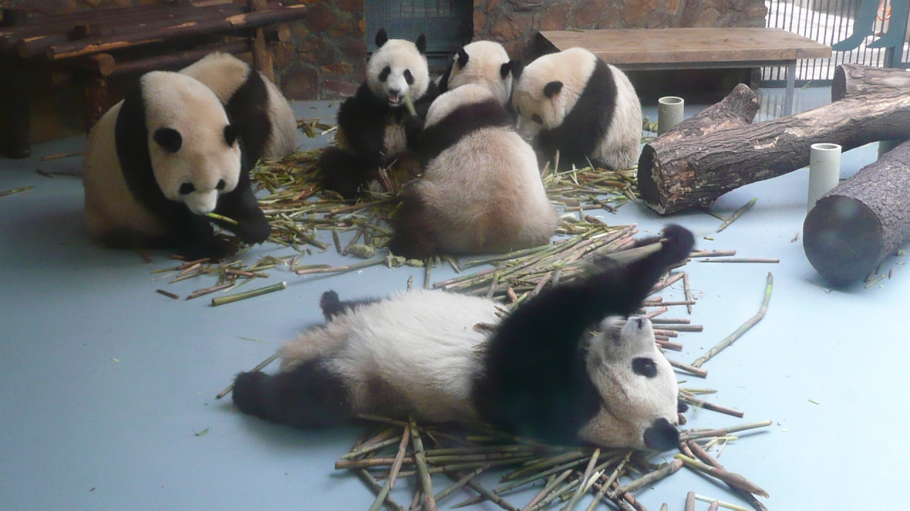 成都市街からTAXIで行きました。かなり期待して出かけたのですが、この日は昼に成都駅へ到着して午後から基地へ行ったことと、急に気温が上がって暑くなったという事でパンダ達は既に外の遊び場から室内へ入れられてしまっていました。ちょっと残念。でも子供たちがみんなで笹を食べる姿も見れたのでやはり行って良かったです。