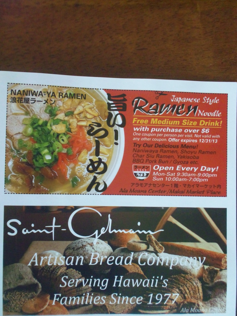 アラモアナSC内に置いてある「フリ−ペーパー」は、買い物情報やフードコートのクーポン券が入っていて、大変お得!!!