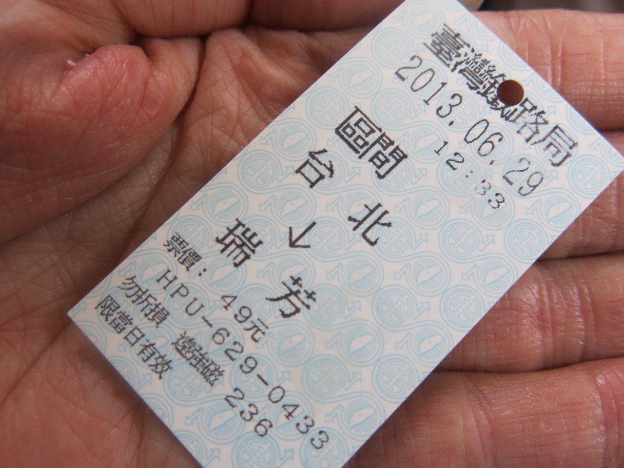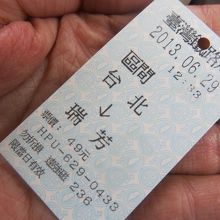 台北から瑞芳までは自強号で76元、區間車(各駅停車、ローカル)で49元でした。自強号に乗りたかったのですが、本数が少ないため、いったん切符を払い戻して、區間車の切符を買いなおしました。區間車でも40分ほどです。